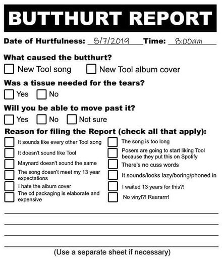 É claro que a internet correu rápido com a oportunidade de julgar (e reclamar) do single, de uma maneira tão cômica que até virou um minimeme numa comunidade online do Tool, vide “formulário de reclamações” criado por um fã, abaixo. Entre os itens a serem marcados, há “não parece o som do Tool” e “é igual a qualquer outro som do Tool”.